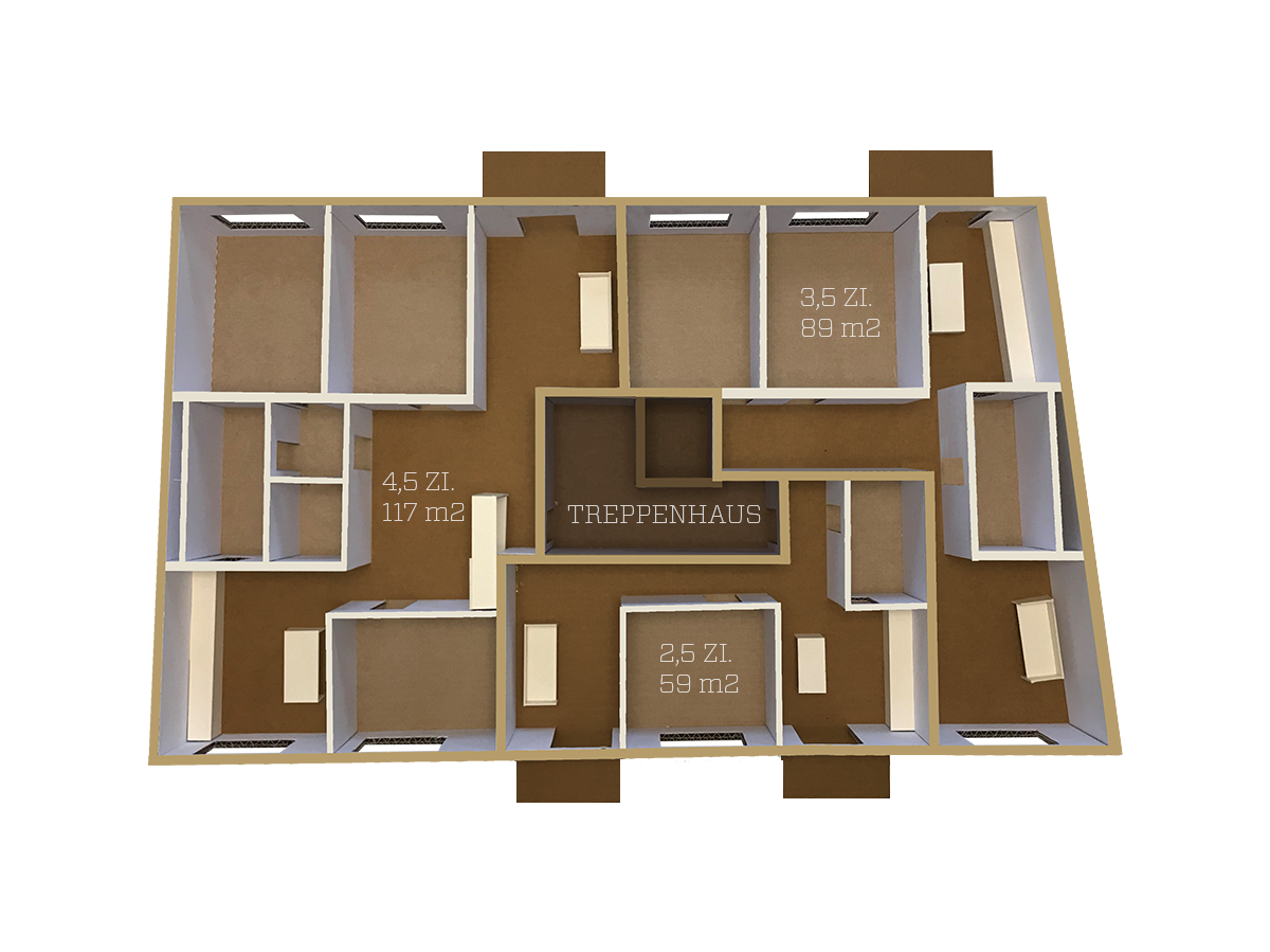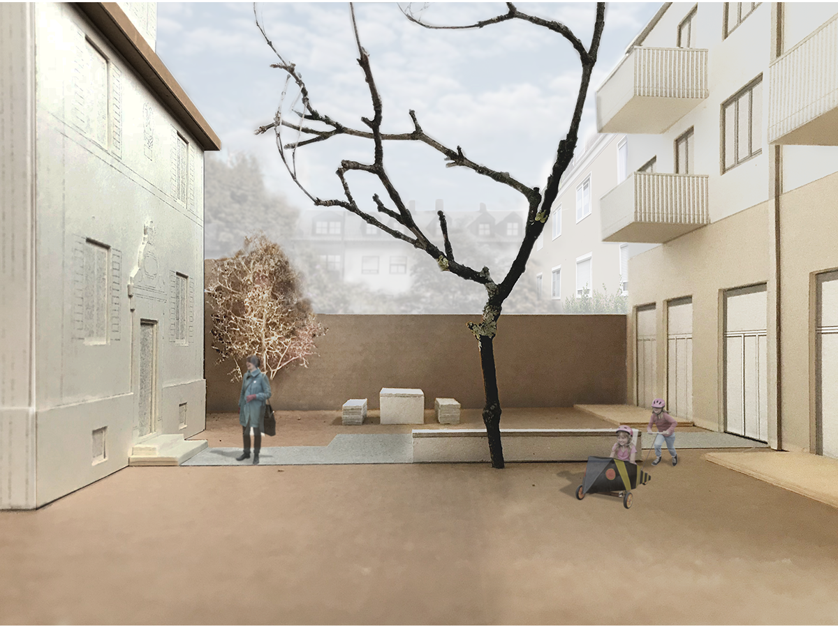 Auf dem bisher gewerblich genutzten Grundstück befindet sich lediglich im rückwärtigen Teil ein historisches Stadthaus. Durch die Schließung der Baulücke zur Straße wird für eine Baugemeinschaft ein stimmungsvolles Ensemble aus Alt und Neu geschaffen. Im Vordergebäude entstehen acht unterschiedlich geschnittene Wohnungen. Die Grundrisse sind einerseits geprägt durch fliessende Räume, die Straßen- und Hofseite verbinden; andererseits bieten neutrale Räume verschiedene Nutzungsmöglichkeiten, wie bei einer Altbauwohnung. Durch die tiefer liegende Hofebene besitzt das Vordergebäude im EG überhohe Atelierräume, die sich zum gemeinschaftlich genutzten Hofraum orientieren. Dort sind zwei kleine gewerblich nutzbare Einheiten sowie ein Gemeinschaftsraum angeordnet. Zur Straße orientiert befindet sich ein großzügig geschnittener Fahrradraum und weitere Abstellbereiche, so dass im Rahmen eines Mobilitätskonzepts die Anzahl der Stellplätze deutlich reduziert werden konnte.