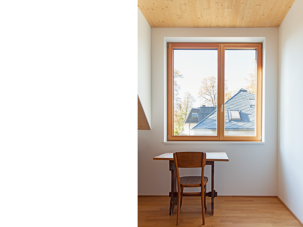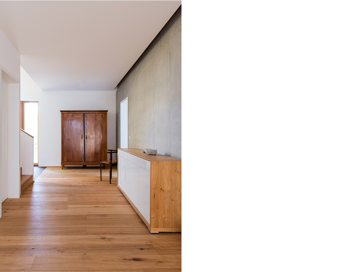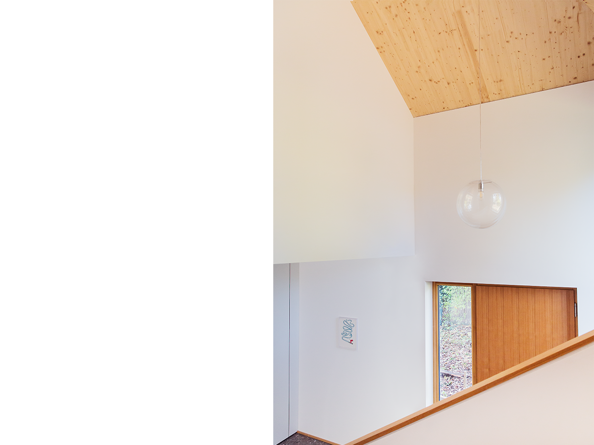 Im rückwärtigen Teil eines großen Grundstücks mit altem Baumbestand werden behutsam zwei Einfamilienhäuser als weitere Bausteine eines Familienensembles eingefügt. Durch die Gebäudepositionierung und die Anordnung der Öffnungen wird ein ausgewogenes Verhältnis von Gemeinschaftsbezug und Privatheit erzeugt. Die beiden ähnlichen, auf die individuellen Wohnvorstellungen der beiden Familien maßgeschneiderten Häuser besitzen als räumliche Besonderheiten jeweils eine zweigeschossige Eingangshalle, einen fließenden Raum im Erdgeschoss und überhohe Räume im Obergeschoss, die sich bis an den Firstpunkt des Zeltdachs erstrecken.