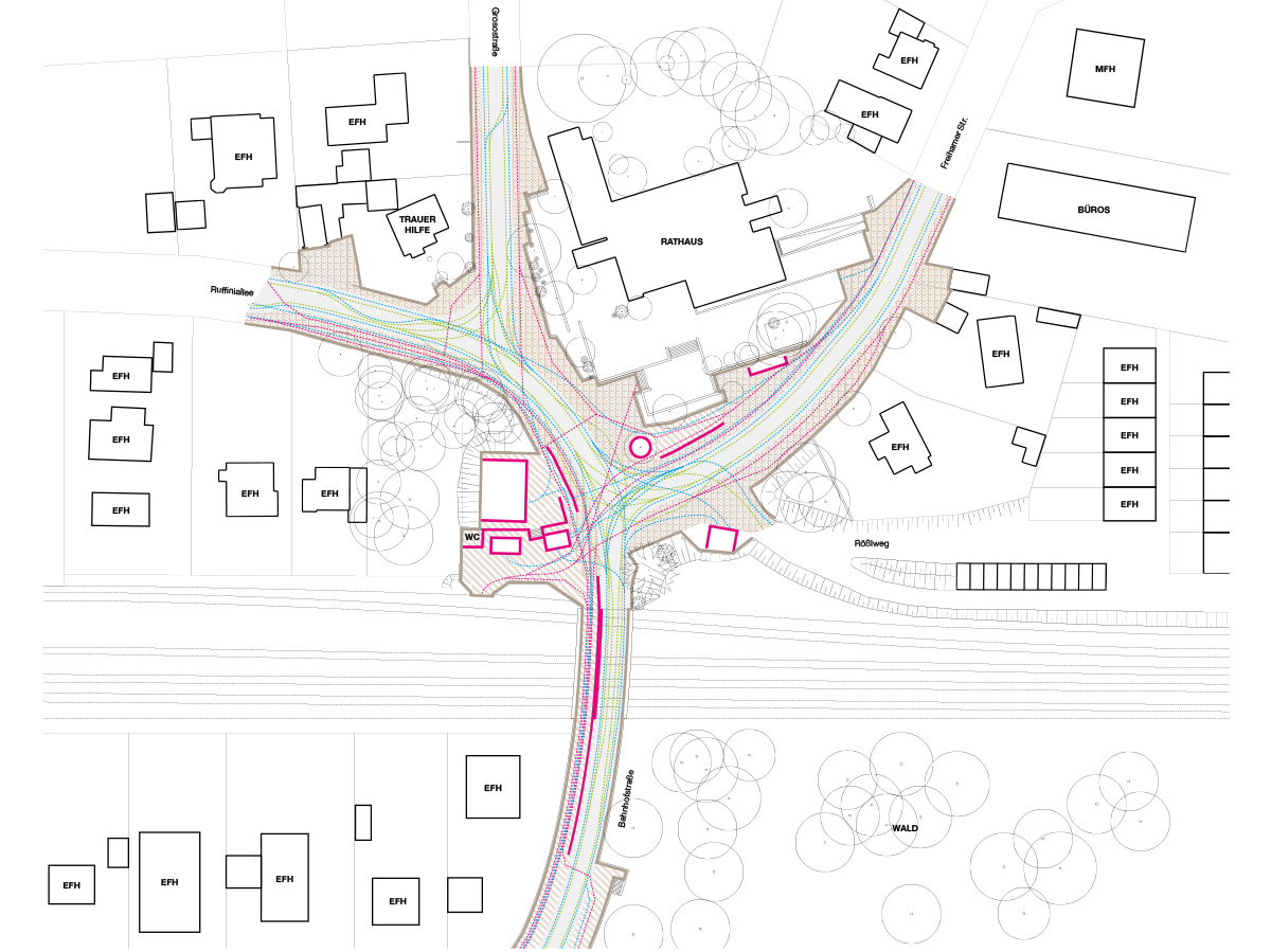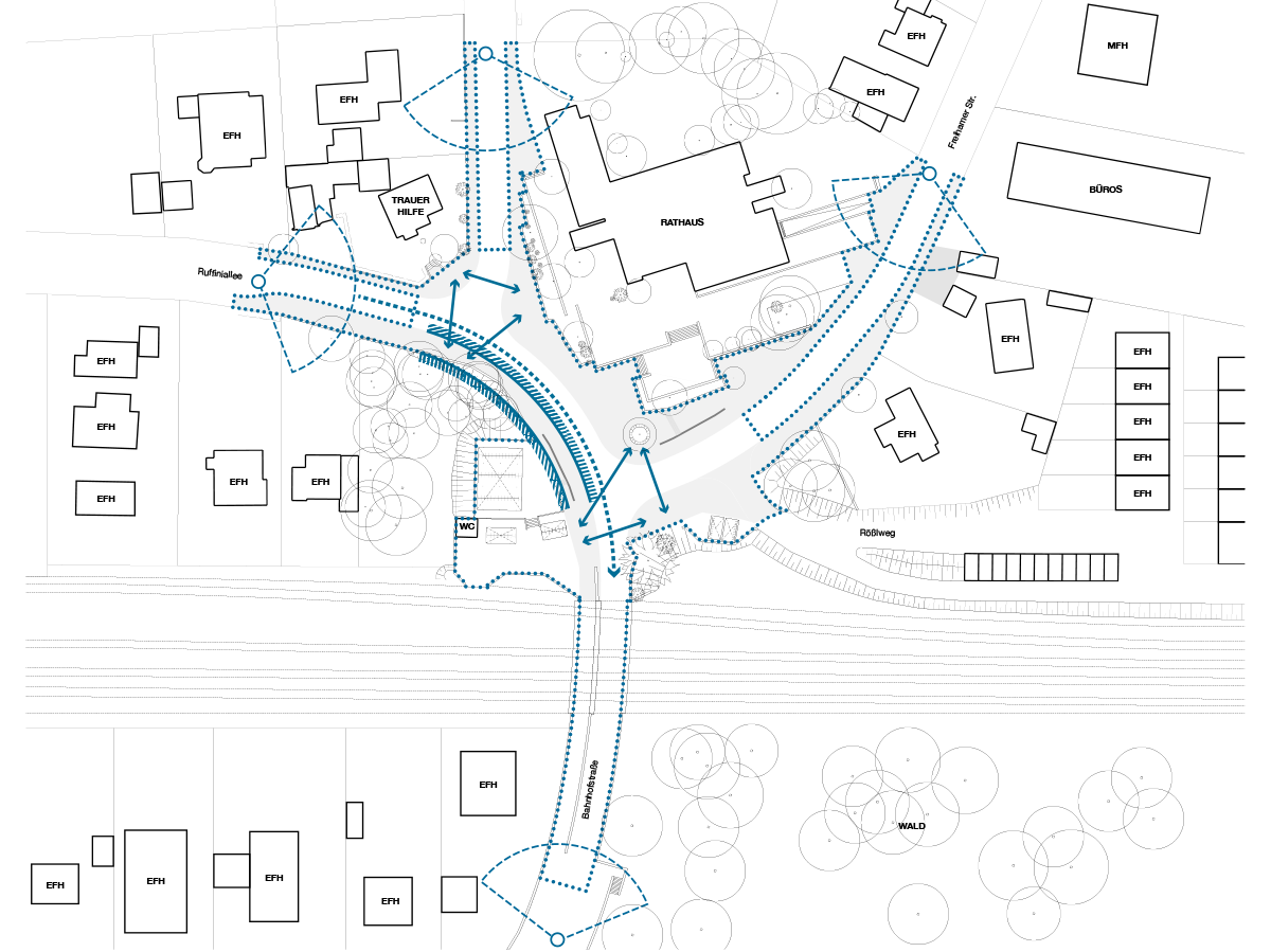 Der Rathausplatz der Gemeinde Gräfelfing, südwestlich von München, liegt direkt am S-Bahnhof. Über dem Platz thront das markante Rathaus von 1967 der Münchner Architekten Peter Biedermann und Werner Böninger. Aufgrund seiner wichtigen Lage im Ort kreuzen sich hier viele Wege. Vor einigen Jahren wurde der Platz als sogenannter Shared Space gestaltet. Die nun folgende behutsame Weiterentwicklung des Platzes mit punktuellen Gestaltungsmaßnahmen stärkt dieses Leitbild und verankert den Platz mit der nahegelegenen belebten Bahnhofstraße als starke Ortsmitte in Gräfelfing.