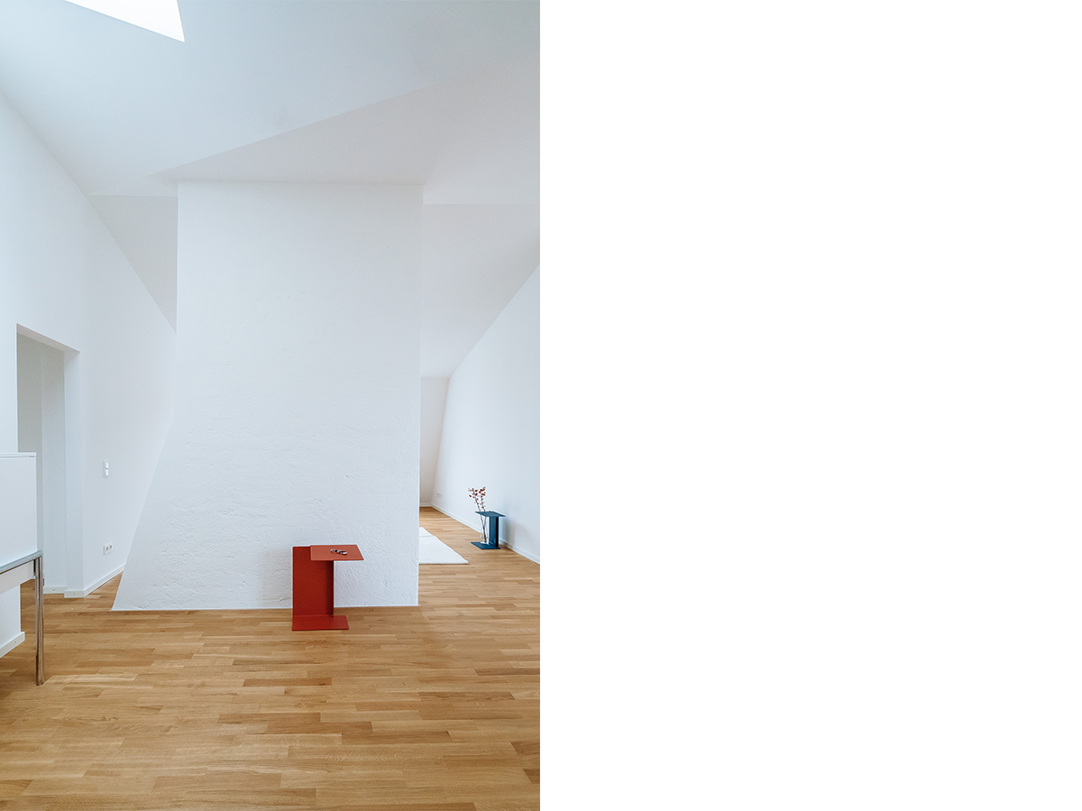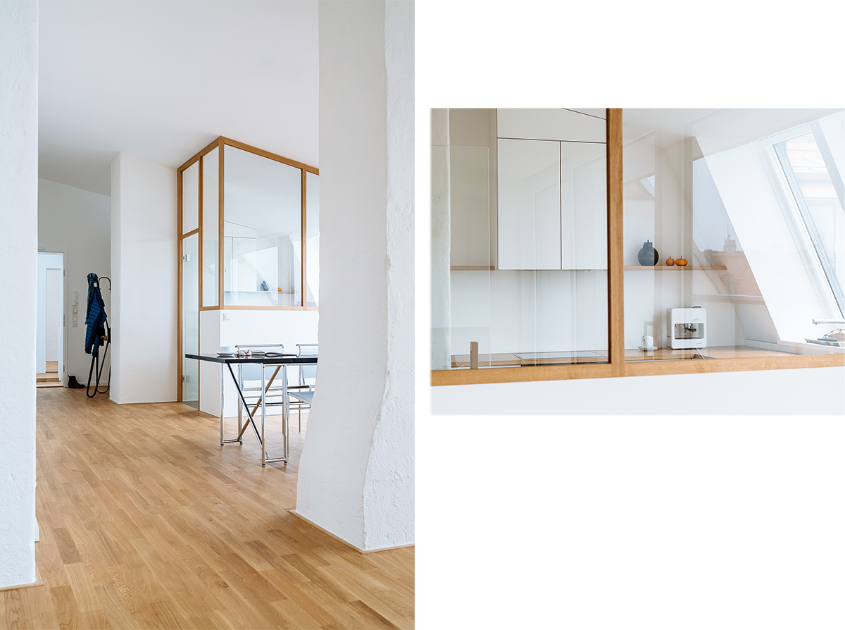 Die beiden Wohnungen im neuen Mansarddach thematisieren die Besonderheit des Eckgebäudes aus den 50er Jahren und die Großzügigkeit des Dachraums. Dieser ist in seiner gesamten Dimension innerhalb der Wohnung immer wieder erlebbar. Bestehende Kamine gliedern den Dachraum zusätzlich und wirken wie große Raumskulpturen. Blickachsen in verschiedene Richtungen sowie fließende Raumbeziehungen zwischen Straße und Hof tragen zur besonderen Innenraumqualität bei. Die verglasten Küchen, die die historische Typologie der „Münchner Küche“ aufgreifen, und die Ess- und Wohnbereiche erfahren über große Dachterrassen eine Ausweitung zum ruhigen Hof.