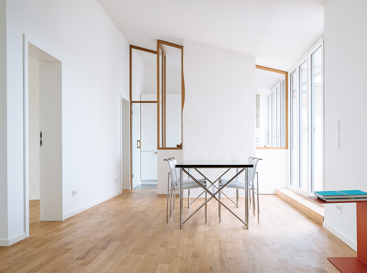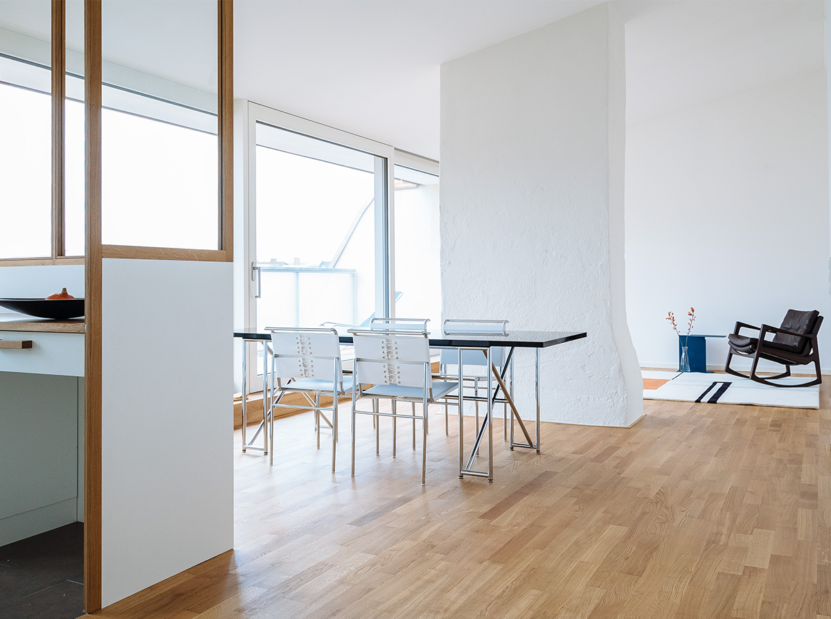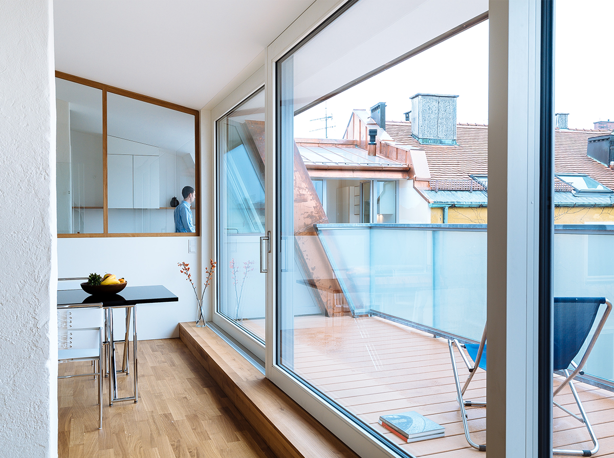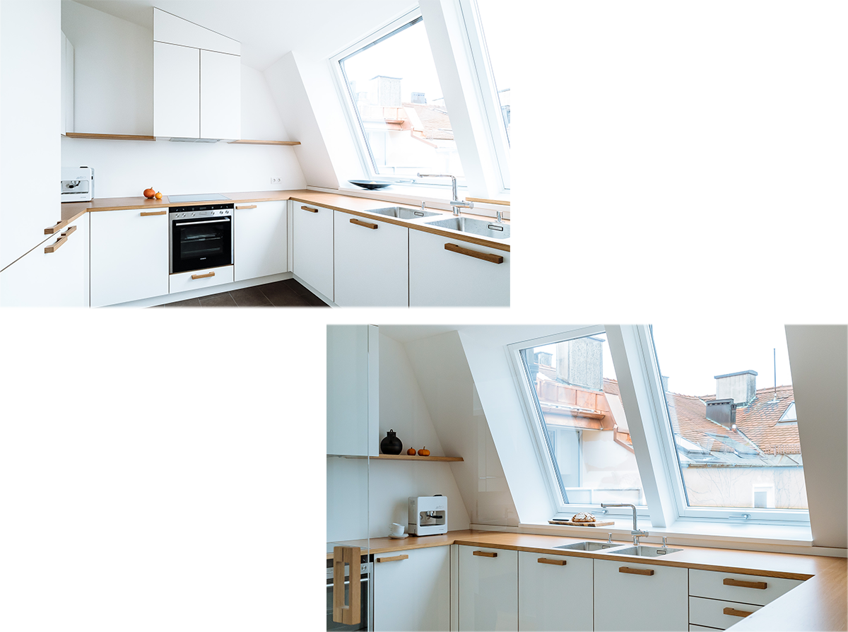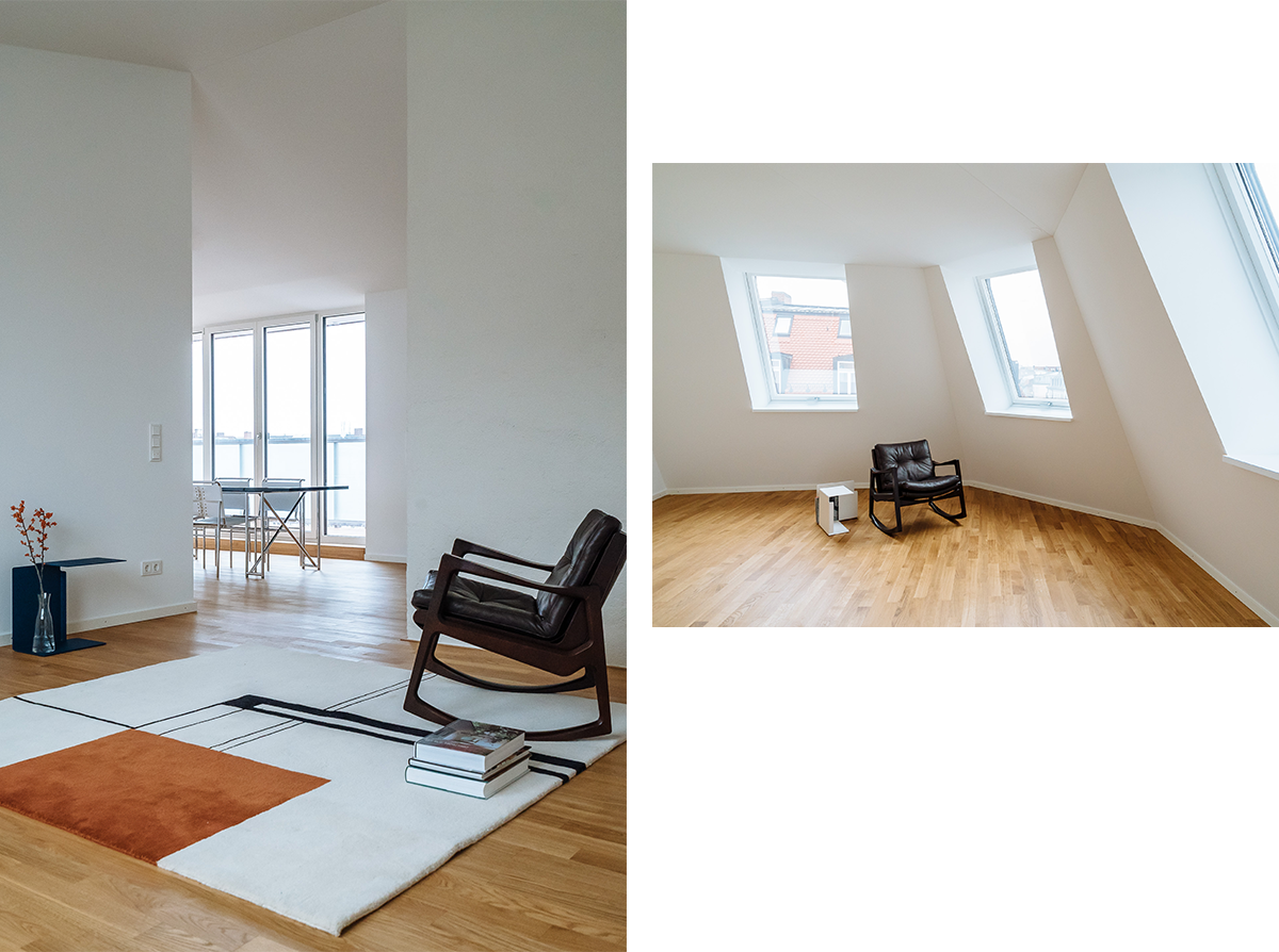 Die beiden Wohnungen im neuen Mansarddach thematisieren die Besonderheit des Eckgebäudes aus den 50er Jahren und die Großzügigkeit des Dachraums. Dieser ist in seiner gesamten Dimension innerhalb der Wohnung immer wieder erlebbar. Bestehende Kamine gliedern den Dachraum zusätzlich und wirken wie große Raumskulpturen. Blickachsen in verschiedene Richtungen sowie fließende Raumbeziehungen zwischen Straße und Hof tragen zur besonderen Innenraumqualität bei. Die verglasten Küchen, die die historische Typologie der „Münchner Küche“ aufgreifen, und die Ess- und Wohnbereiche erfahren über große Dachterrassen eine Ausweitung zum ruhigen Hof.